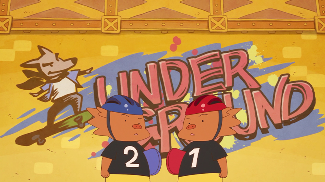 スケボーしょうねんの イノとニノたちが まいにち れんしゅうする まちのスケボーじょうが らくがきだらけに。