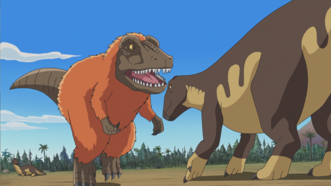 恐竜の時代に来てしまったダイヤ、マーレ、キュリは、エドモントサウルスの子どもが、最強の肉食恐竜・ティラノサウルスに追われているのを発見する。そこにあらわれたのは親のエドモントサウルス。子どもを逃がそうとティラノサウルスに必死に立ちむかう。しかしするどい歯と強力なツメになすすべがなく、たおされてしまった。そしてティラノサウルスの次のターゲットは…ダイヤたちだ! 走れ! 逃げろ! サバイバルするんだ!