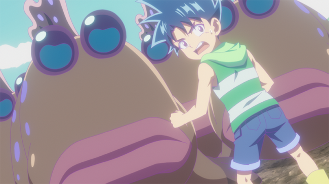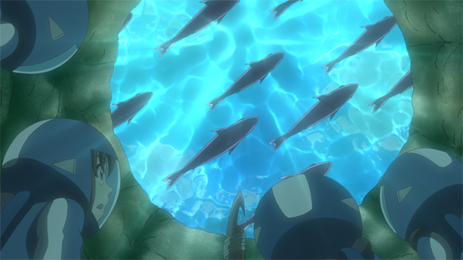 干潟(ひがた)は食物(しょくもつ)連鎖(れんさ)の現場。ノウ博士のスーツで小さくなったジオたちは、うってつけのエサだ。カニに鳥…生きものたちがおそいくる。そしてせまる満潮(まんちょう)! 波にさらわれないよう、サラと海鮮(ウミキ)の知識を生かして、ユムシの巣穴へ。ユムシはソーセージのような形のブヨブヨした生きものだ。穴のおくにユムシがいるかもしれないと思いながら、4人はいつのまにかねむってしまう。