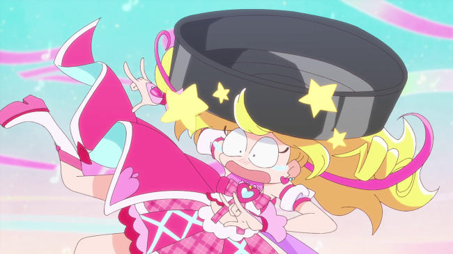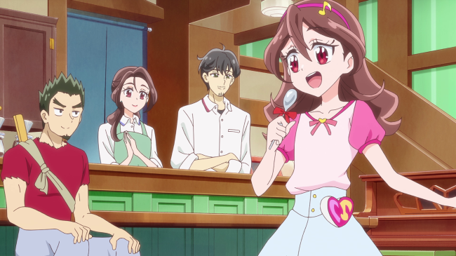 久しぶりに訪れたグリッターが休憩中で肩を落としたヒロシをチョッキリーヌが狙い、ダークランダーを出現させました。お笑いネタのような攻撃に翻弄されるキュアアイドルたちでしたが、無事ヒロシを助け出します。そして、再びお店にやってきたヒロシから明かされたメニューの正体は、「おもしろい一発ギャグ」でした。お客さんたちを楽しませようと和が考えたものの、すべってばかりで封印したものでしたが、そんな姿に勇気をもらい、芸人を目指したと語るヒロシ。和の一発ギャグの代わりにうたが歌を披露し、お店が盛り上がる中、はもりは「ズンドコ一件落着ぞな!」と事件の解決を宣言するのでした。