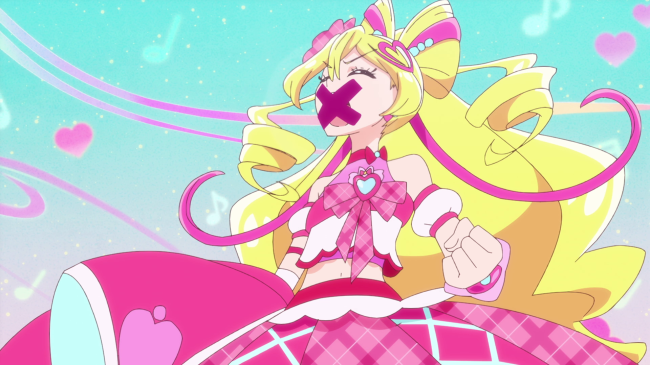 ダークランダーは駆けつけたプリキュアたちの口をふさぎ、ステージを妨害します。しかし、アイドルは大声を挙げて封印を解き、軽やかに歌い始めます。そして、パワーアップしたステージによって、ダークランダーをキラッキランランにしました。